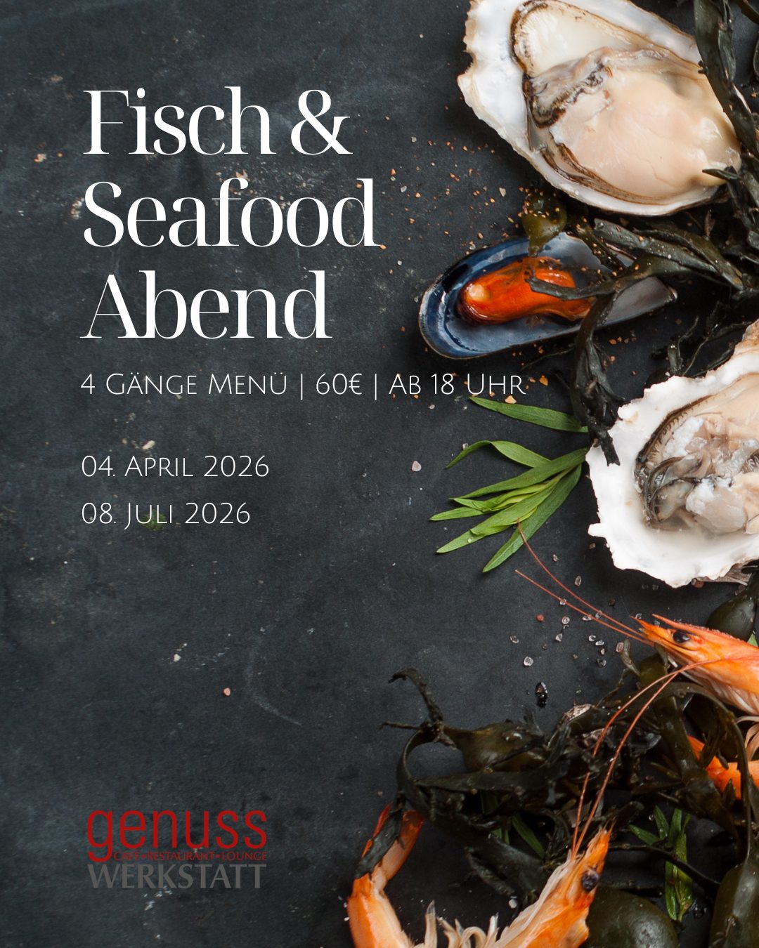 Allgemein, Classics Fisch & Seafood Abend4 Gänge Menü in der Genusswerkstatt Koblenz04. April 202608. Juli 2026Einlass: ab 18 Uhr | Preis: 60 €Sie können auch telefonisch reservierenunter: 0261-914 417 25Bitte nur verbindliche Reservierung mit genauer Personenanzahl! FB TW TB